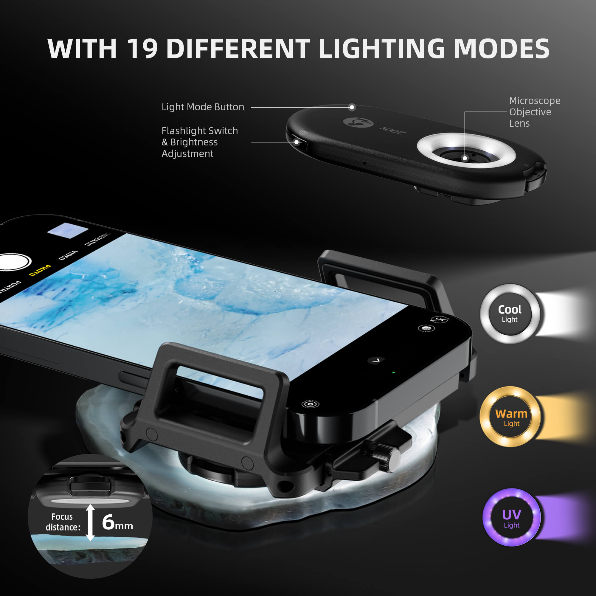 - Eingebaute LED + UV-Beleuchtung: Drei Helligkeitsstufen, Kalt- und Warmlicht wählbar – auch bei wenig Umgebungslicht klare Bilder